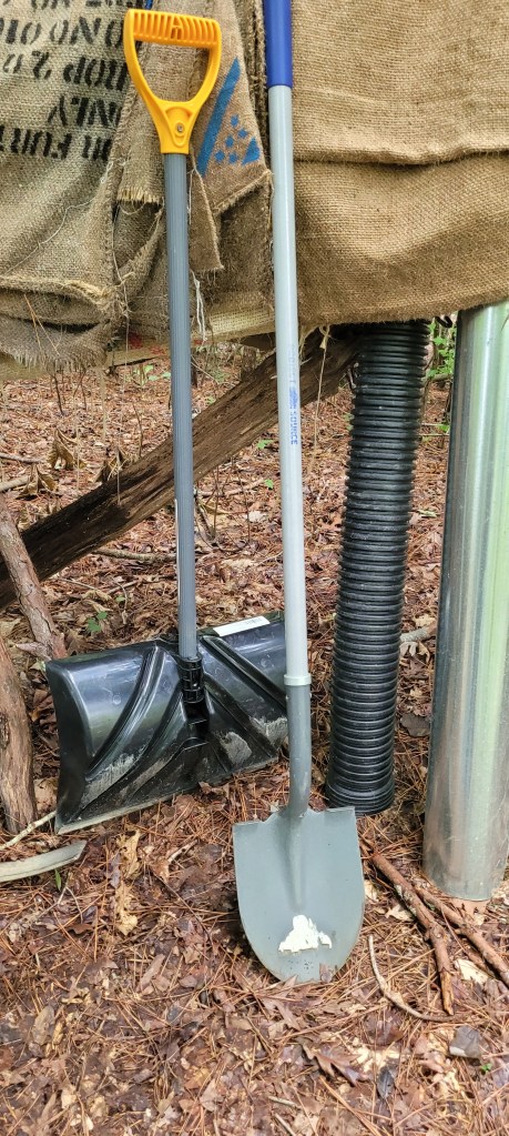A shovel with a pointed tip is good for digging and prying up small plants and stems of undergrowth. Snipping off the main stem with the loppers is necessary, but at least half the tree or plant often resides under the surface, and can enable its regrowth. This points to the amazing resilience of nature but can be frustrating if you’re trying to prep land for building.